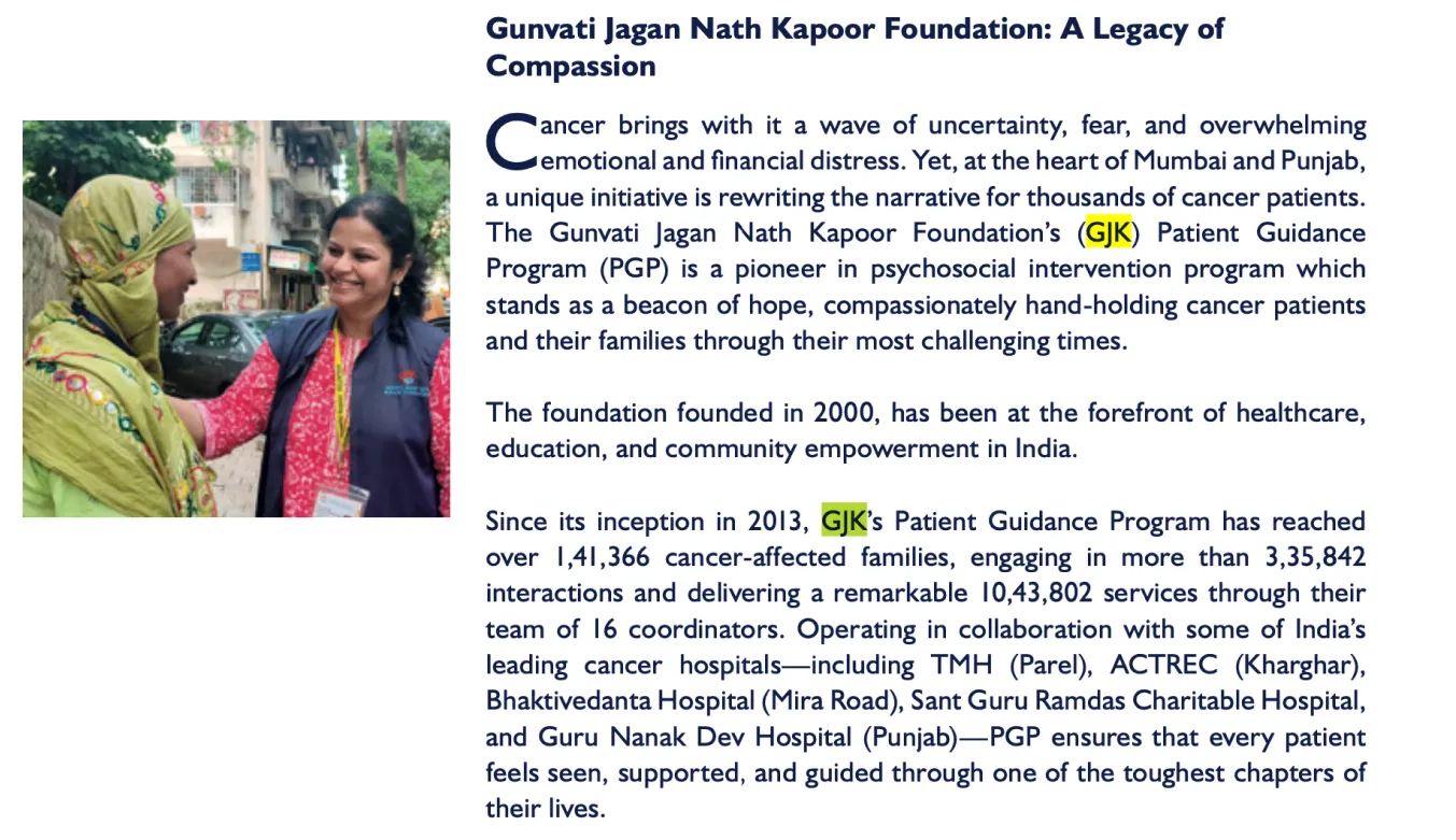 Making An Impact: Honoured to be recognised in Tata Memorial Centre's (TMH) Quarterly Digest who spotlighted us (GJK Foundation). A proud Moment. (Page 29-31)